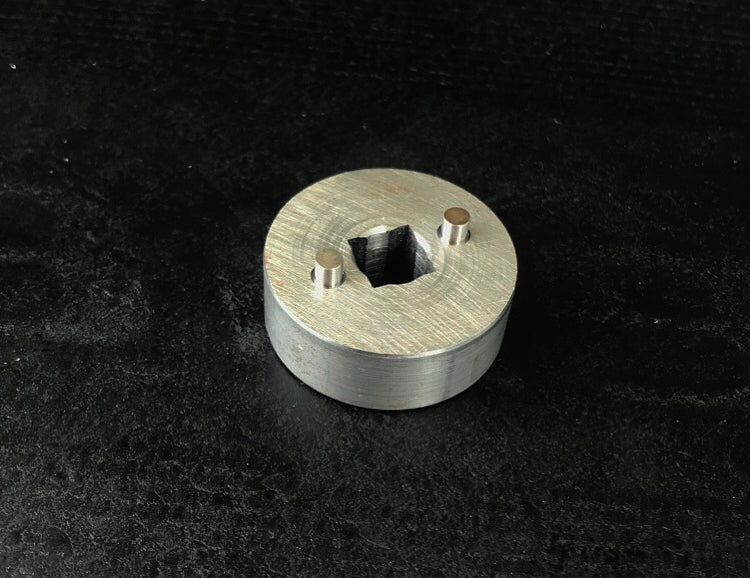 Our Custom Performance Piston Retraction Tool fits onto the end of a 3/8" ratchet extension, with the 2 pins in the tool matching perfectly with the 2 holes in the top of the Rear Caliper Piston.