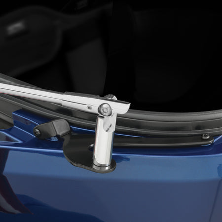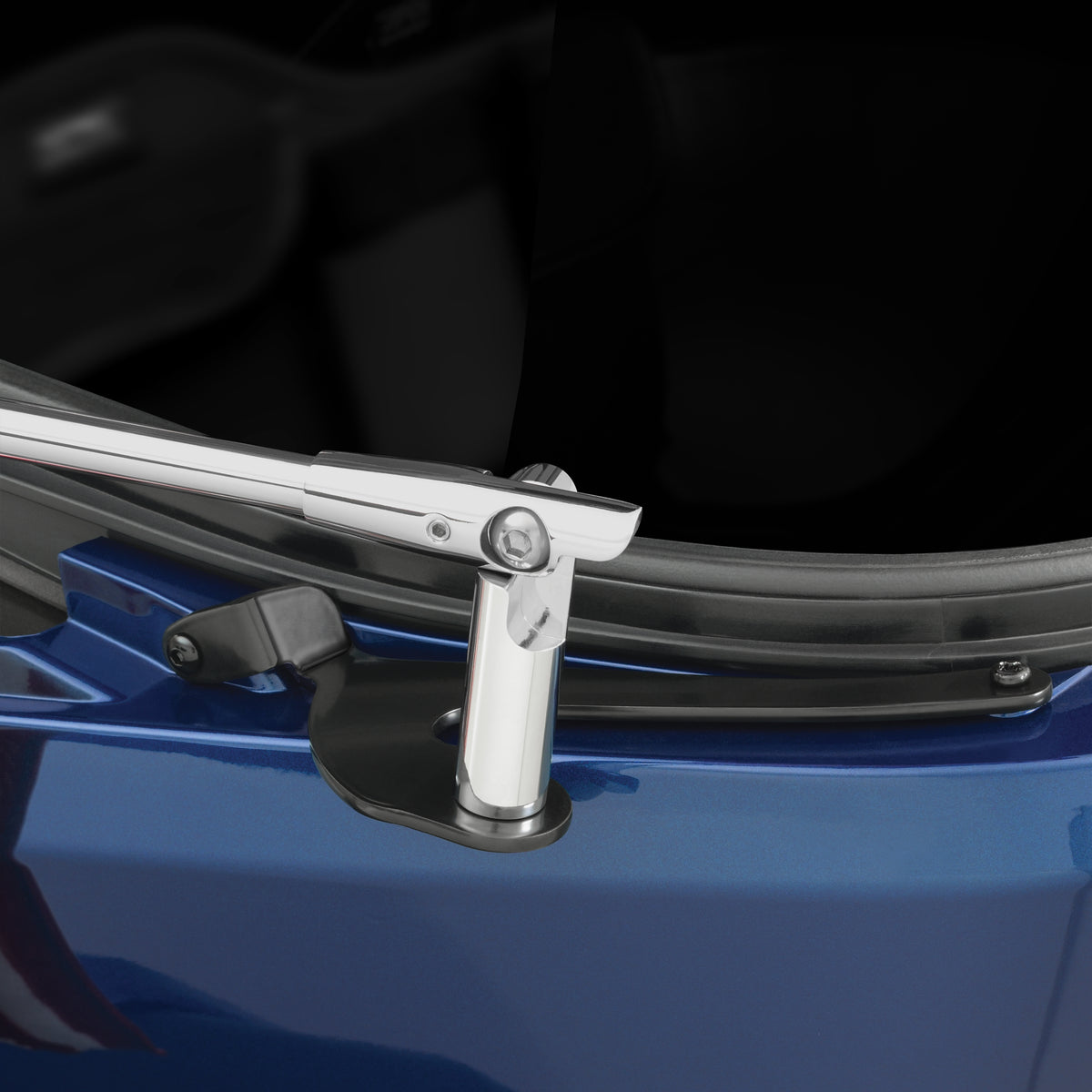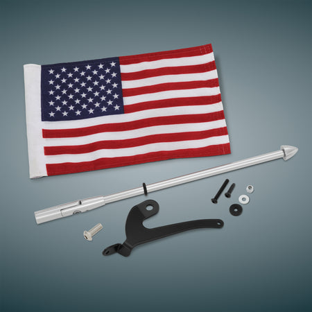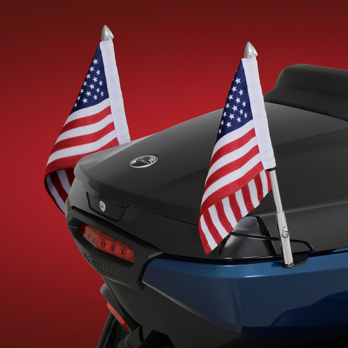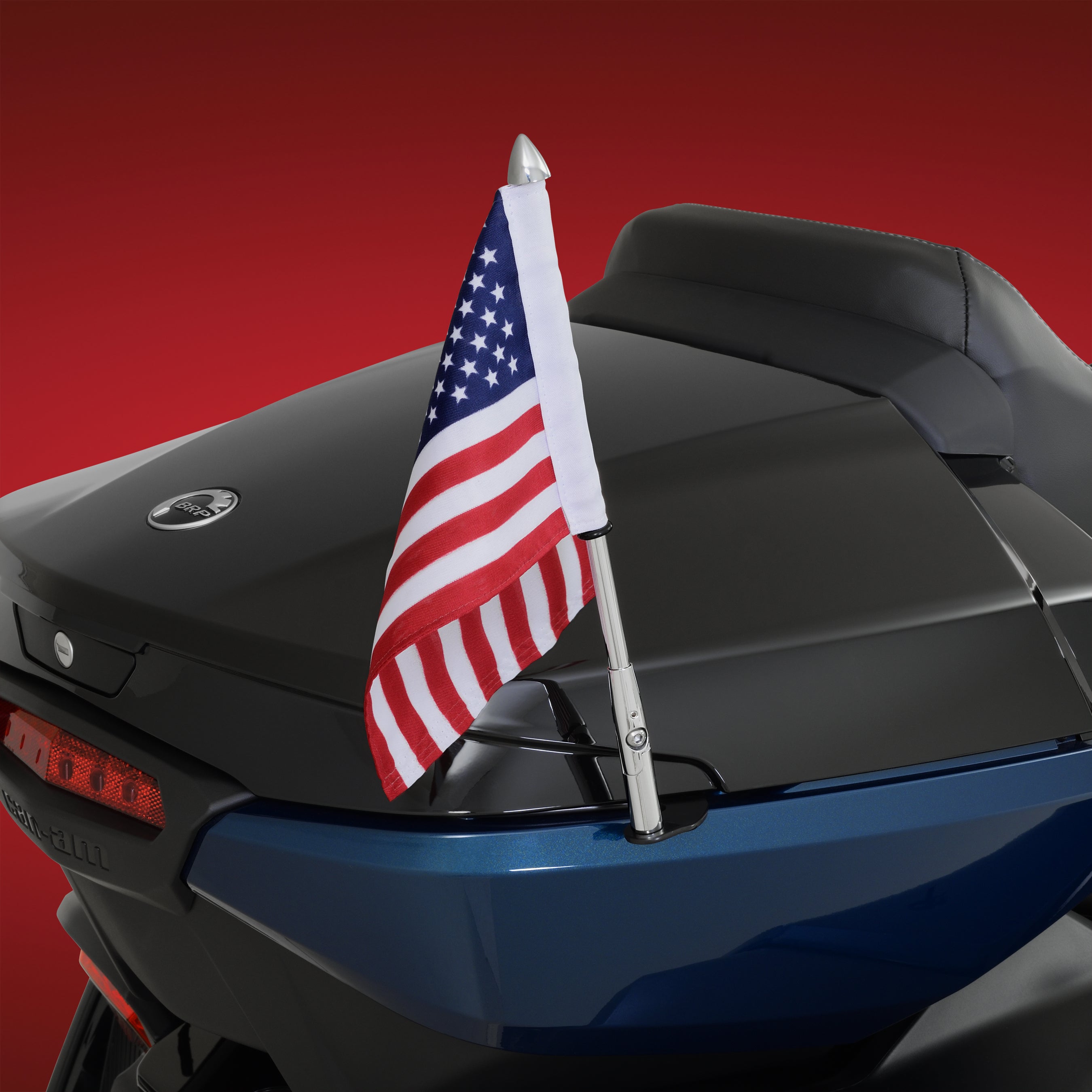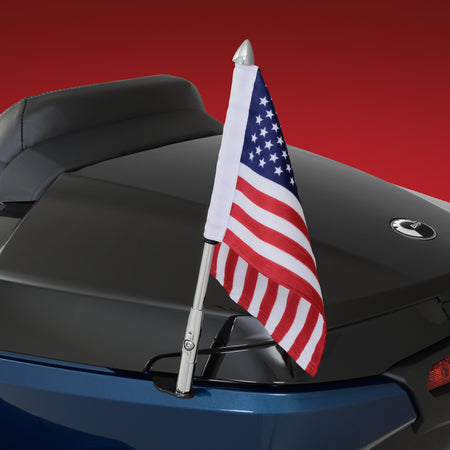 Show Chrome Accessories™ introduces two flag poles for the Can-Am RT and F3 LTD trunks. Conveniently folds forward allowing them to tuck out of the way for easy cover placement. Flag pole comes in either a right or left mount, so you can choose the perfect side or get them both. A 10 degree cant allows a slight rear angle and mounts to two existing fairing hole mounts. A longer screw and nut is included to bolt through the inner trunk shell for a secure fit. Comes with US flag and all required hardware. Chrome pole with satin black mounts.